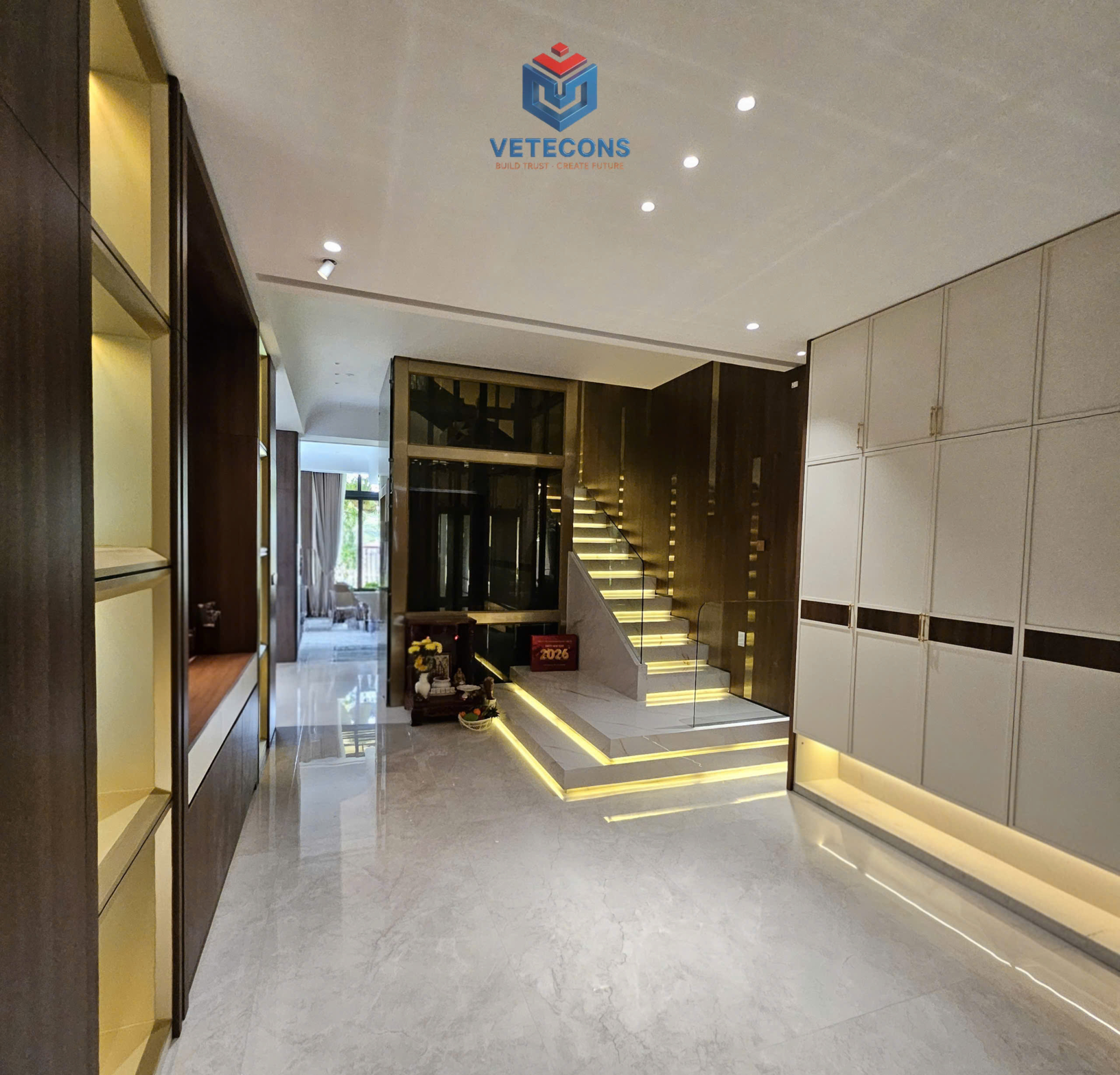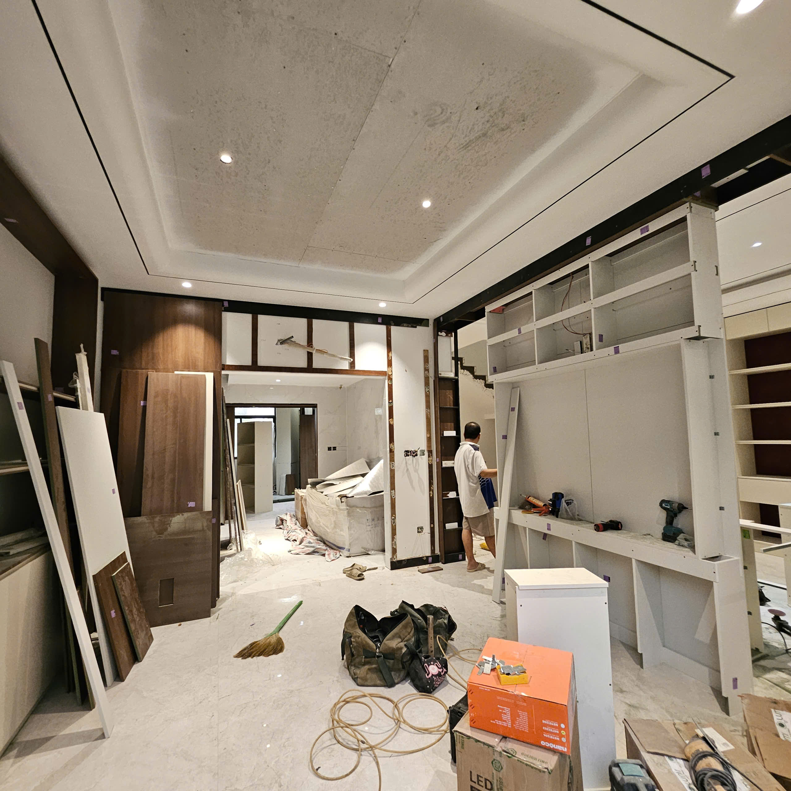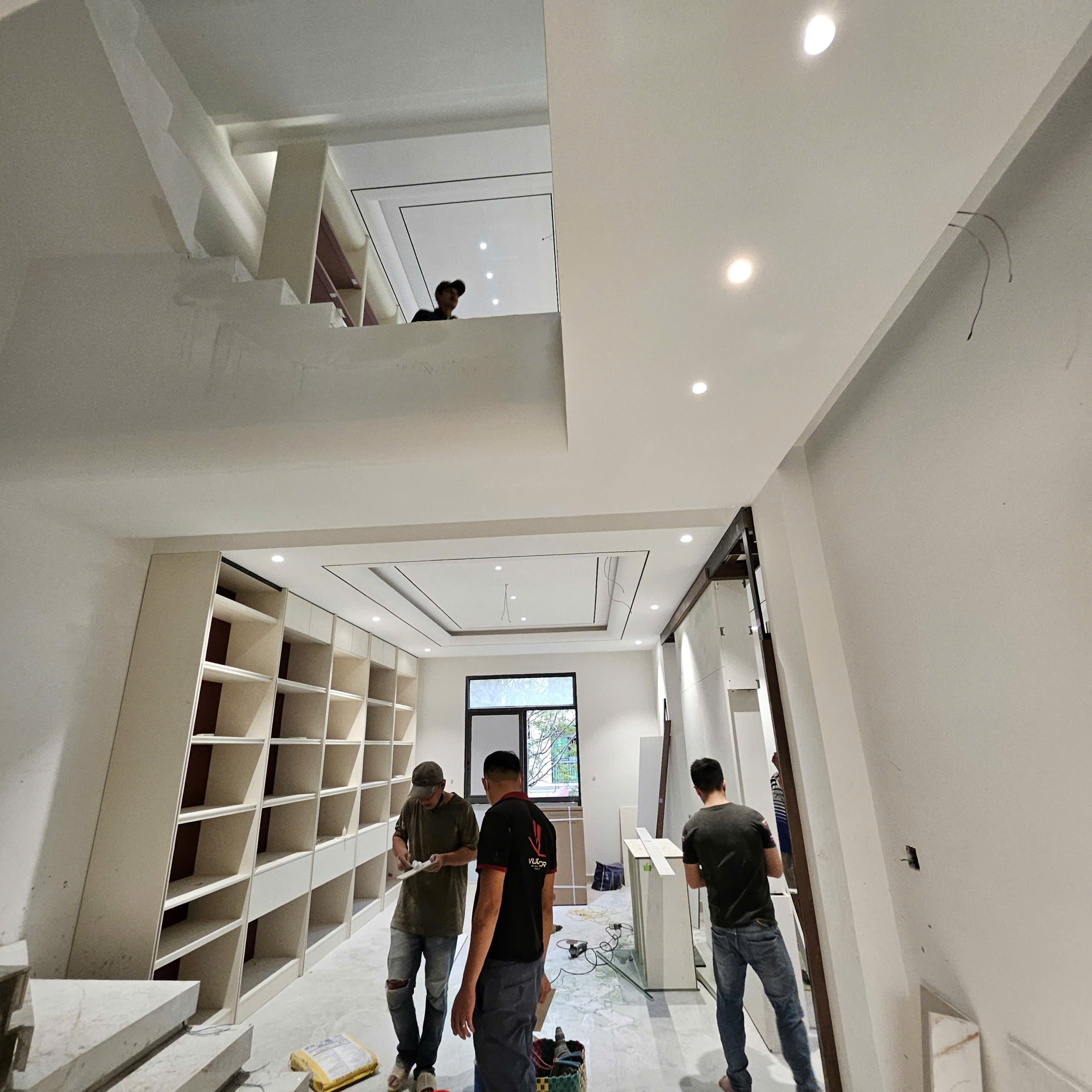 Đến phần hoàn thiện, công trình thực sự “lột xác”. Từ ốp lát gạch khổ lớn, sơn nước cao cấp, trần – đèn chiếu sáng cho tới đồ gỗ đóng theo thiết kế, tất cả đều được kiểm soát kỹ từng chi tiết. Màu sắc, vật liệu và ánh sáng được phối hợp để tạo cảm giác rộng rãi, ấm cúng nhưng vẫn hiện đại. Các hạng mục đều được nghiệm thu theo từng bước, chỉnh sửa tỉ mỉ trước khi chuyển sang công đoạn tiếp theo.