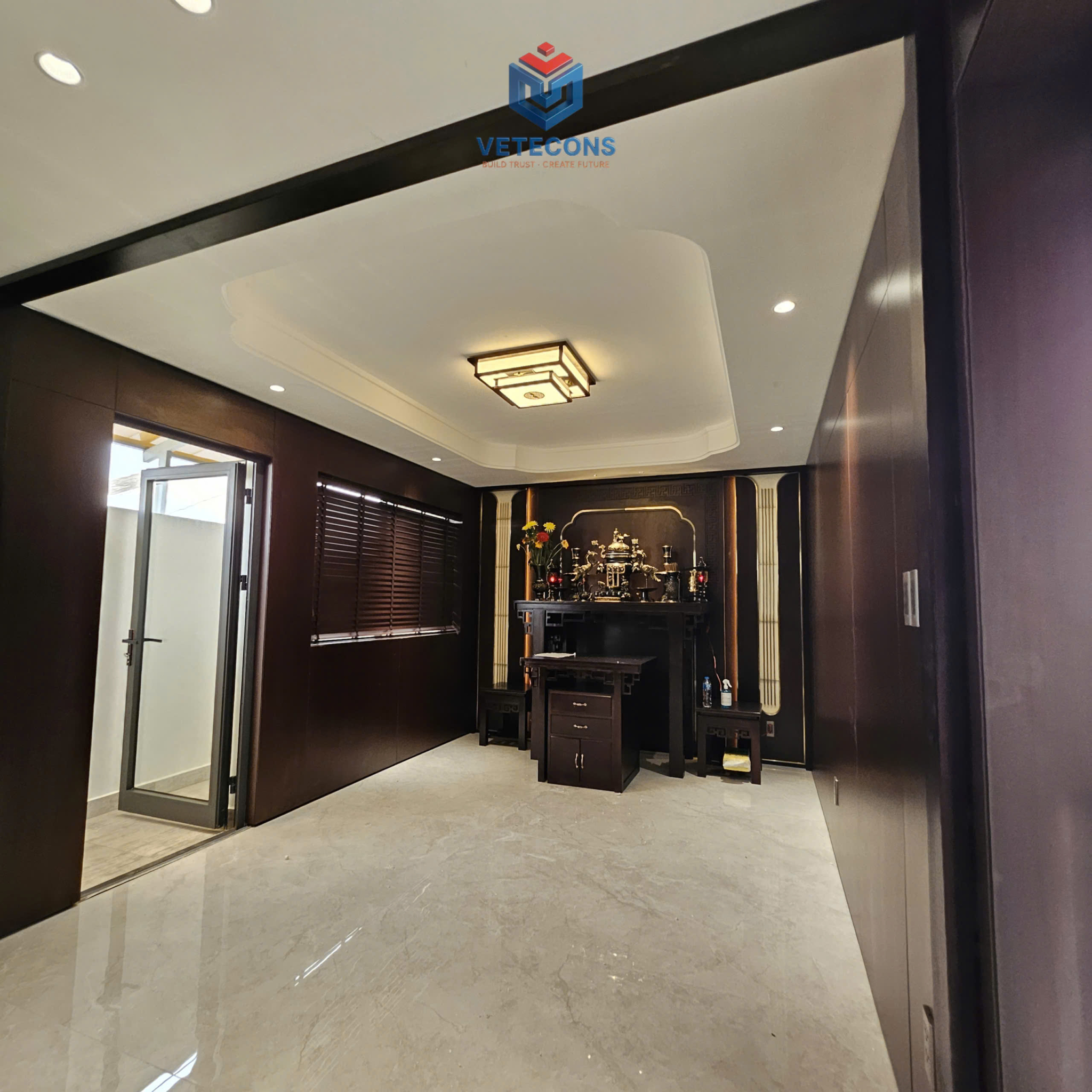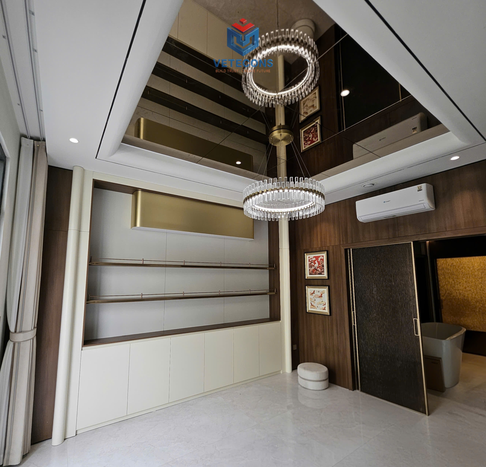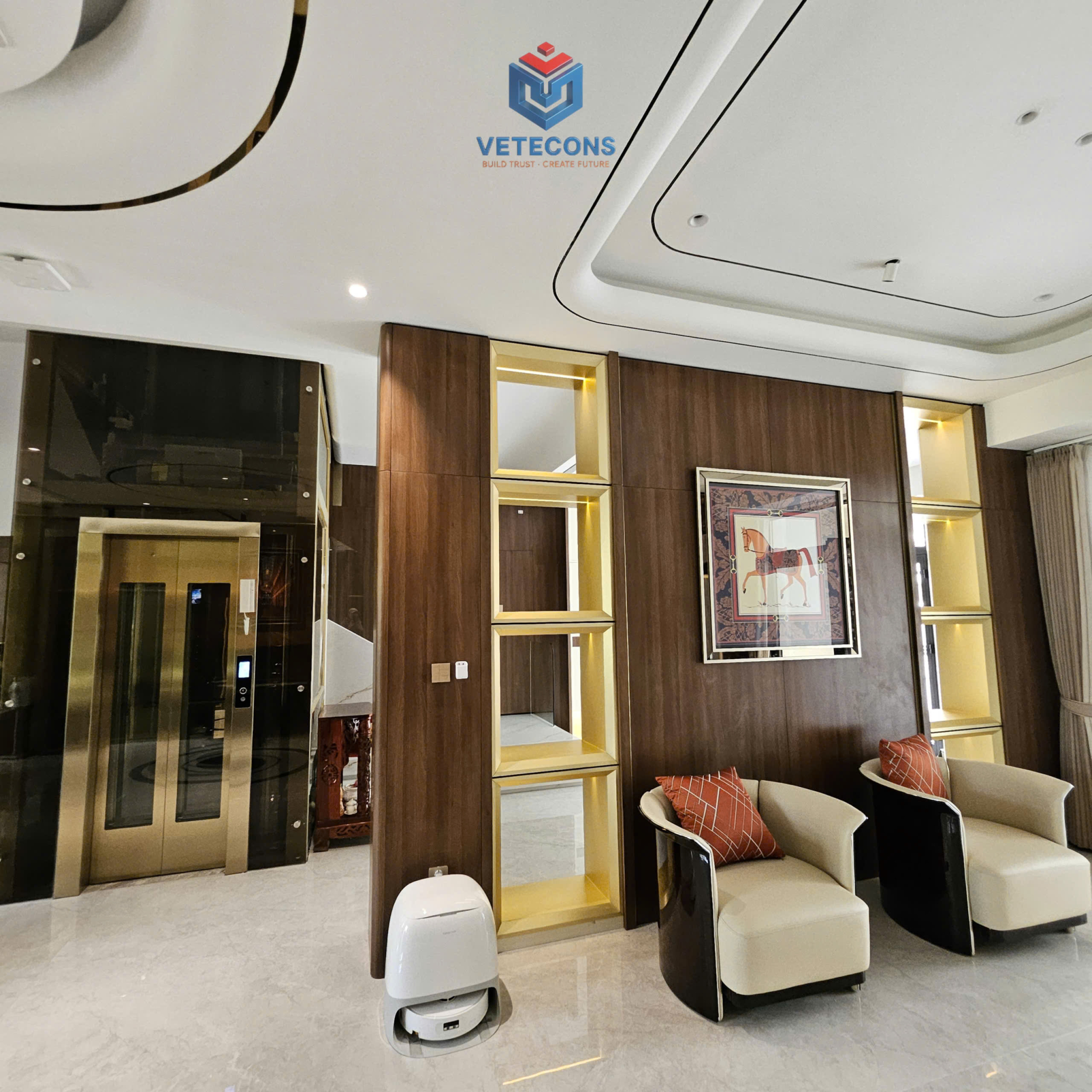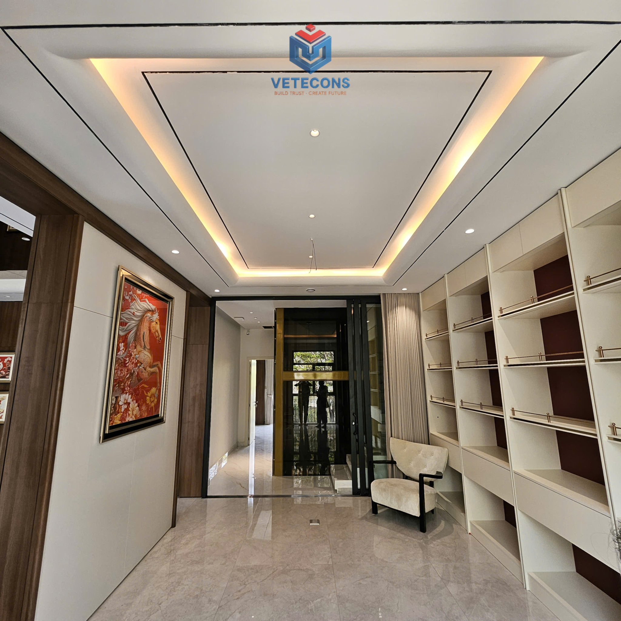 Đến phần hoàn thiện, công trình thực sự “lột xác”. Từ ốp lát gạch khổ lớn, sơn nước cao cấp, trần – đèn chiếu sáng cho tới đồ gỗ đóng theo thiết kế, tất cả đều được kiểm soát kỹ từng chi tiết. Màu sắc, vật liệu và ánh sáng được phối hợp để tạo cảm giác rộng rãi, ấm cúng nhưng vẫn hiện đại. Các hạng mục đều được nghiệm thu theo từng bước, chỉnh sửa tỉ mỉ trước khi chuyển sang công đoạn tiếp theo.